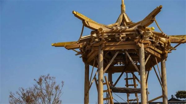 传统晋派建筑之外,在展园的最高点,一座六角亭成为了展园的点睛之笔。六根木柱立于柱顶石之上,柱头冠以六根搭交箍头檐枋,在柱头形成一圈类似圈梁的围合结构,亭子的主体轮廓已经显现。相信世园会开幕之后,太原展园将向游客展现最原汁原味的晋祠园林风貌。