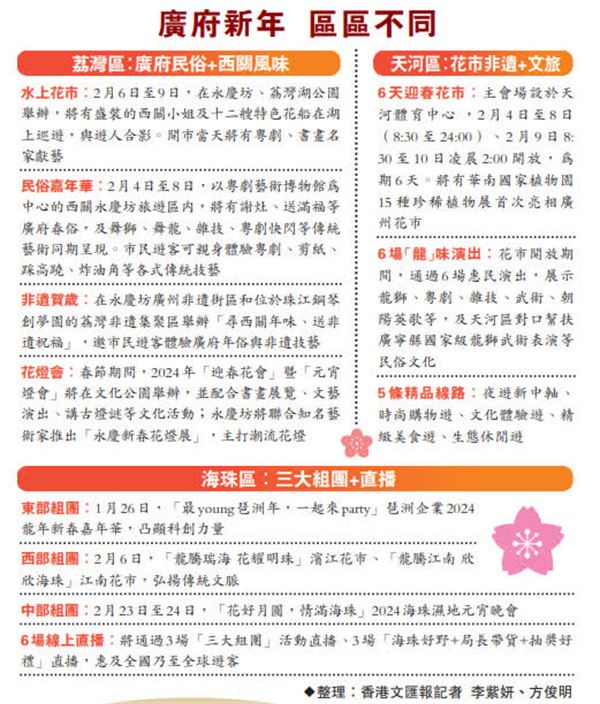 (香港文匯報記者 方俊明、李紫妍 廣州報道)春節將至,廣州啟動「廣州過年 花城看花」 ——『年味最廣州』」系列活動,將在春節期間推出2,500多場文旅活動迎八方來客。而各區也相繼公布新春特色活動安排,特別創新「夜遊」模式,為港人春節北上遊玩提供更多選擇。越秀區啟動2024年「廣府味 幸福年」廣府文化系列活動,重磅推出「廣府十二年味」。荔灣區推出「西關年味禮包」;天河區主打迎春花市+非遺,每日開放至午夜;海珠濕地則有夜間市場、元宵晚會等。隨着廣深港高鐵近日推出兩款多程車票,為港人春節往返粵港遊玩提供便利及優惠,加上「港車北上」將迎來春節首秀,大灣區優質生活圈雛形顯現。