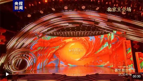 “景屏声光”协同运用,把春晚演播大厅打造成为流光溢彩、绚丽夺目的舞台。写意传神的龙形舞美装置生动演绎出“飞龙在天”的翱翔之姿,上百块LED屏幕配合由总台自主研发的超高清视频控管监系统集中播控,实现春晚舞美场景移步换景。演播大厅各类舞台灯具总计达1462只,数量创历史纪录,开关、亮度、色彩、动作均按节目编程控制,随导演口令操作,静响有度的声场调控与五彩缤纷的舞台灯光高效配合,营造春晚现场喜庆欢腾的热烈氛围。