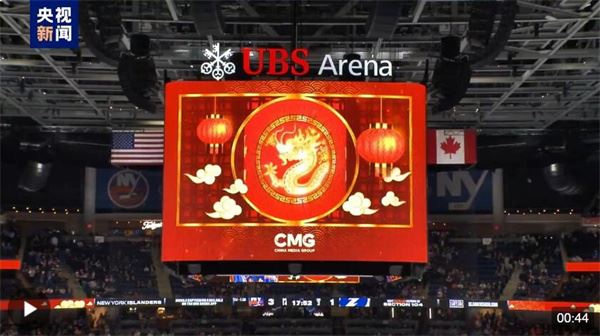 当天,能容纳近两万人的纽约冰球场坐满了热情的球迷,以中国红、龙、祥云为主基调的总台动态海报及360度环绕屏幕上的“龙年快乐”将现场的节庆气氛推向高潮,成了欢腾的海洋。中央大屏播放总台春晚宣传片,以及中外各界人士为总台录制的新春祝福。