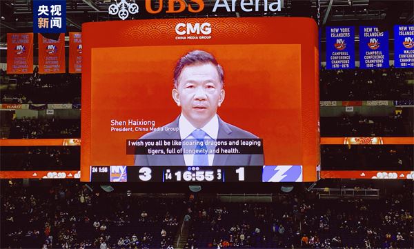 中央广播电视总台台长慎海雄通过视频向现场的美国球迷发表致辞,代表总台祝福朋友们“龙腾虎跃、福寿安康”。