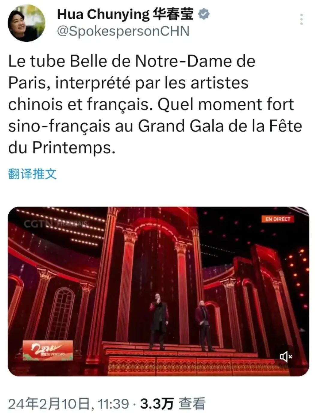 大年初一,外交部部长助理华春莹在X平台发布了总台CGTN法语频道春晚特别节目《龙腾四海 万里迎春》播出的该节目视频,并写道:《巴黎圣母院》选段《美人》由中外艺术家共同演绎。这是春晚盛会中的中法高光时刻。