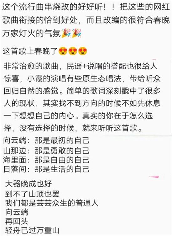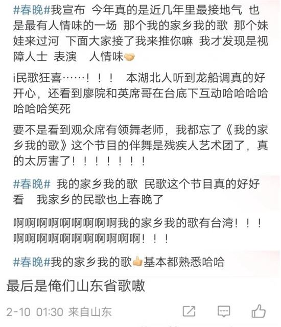 5分58秒演唱10首民歌,歌声要此起彼伏,调度要行云流水,更多细节需要一点一点地抠。从开场《太阳出来喜洋洋》的云开雾散,到《谁不说俺家乡好》的自豪收尾,大家耳熟能详的民歌充满生命力和人情味,展现出这些广为流传的曲调里静水流深的文化力量,也深深唱到了网友的心坎里。