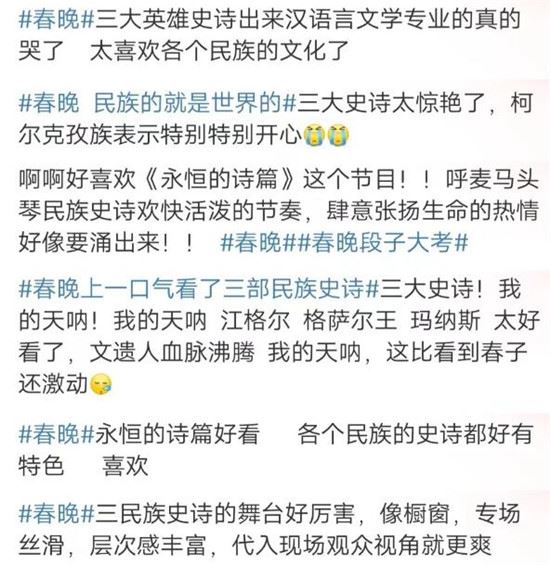 在总台春晚这个全球关注的中国电视盛会上,三部英雄史诗的高燃表演带来一场震撼人心的视听盛宴。正如一位网友所说,不同民族的故事,不同语言的颂歌,但又是这么融洽、和谐、统一,在文明千年的流转之中汇成一首永恒的诗篇。