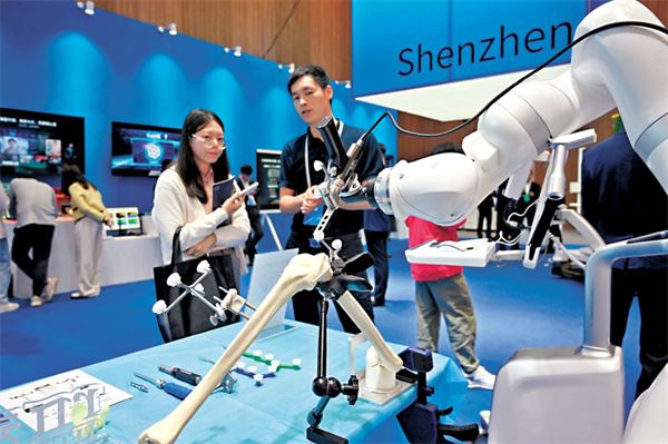 廣東產業科技融合發展成果展在廣東省高質量發展大會期間舉辦,圖為全骨科手術機械人吸引參觀者。(中新社)