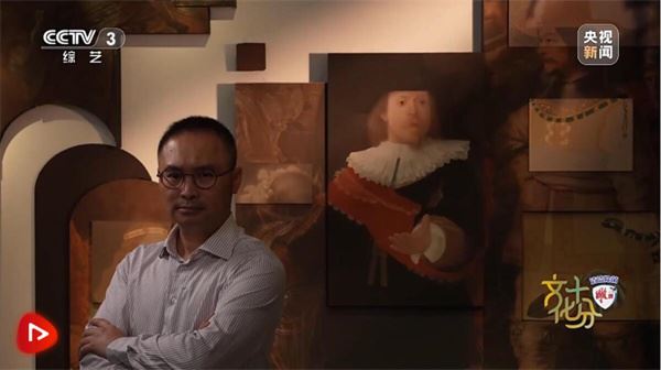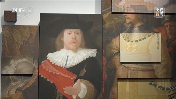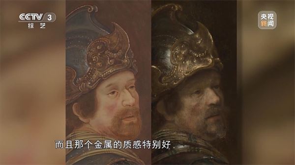 中国艺术研究院工笔画院院长 张见:(对比)这种油画的语言,中国画那种装饰性、像刺绣一样的质感特别好看,显示出工笔画在细节刻画上的优势。伦勃朗的绘画里特别有特色的就是,他喜欢画金属的头盔,而且金属的质感特别好。对应伦勃朗的头盔,刘志蕾用中国传统壁画的沥粉贴金,先用厚重的粉把它堆出立体的质感,然后再贴上金箔,把金箔特别生硬的光泽压下去。这都是原汁原味的中国画方法。