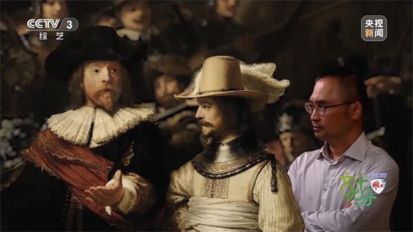 2023年初,《当(夜巡)来到中国》正式亮相。这个高度超过四米、长度超过七米的巨型装置作品,以荷兰画家伦勃朗的油画《夜巡》为创作母本,以中国传统壁画线条及原作底色作为背景,原作主要人物及重要局部则以绢本设色的工笔方式着重绘制,两部分重叠组合,整体不失伦勃朗绘画的凝重气质,笔墨线条中又充满一派中国气象。