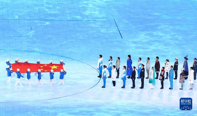 2月4日晚,第二十四届冬季奥林匹克运动会开幕式在北京国家体育场举行。这是中华人民共和国国旗入场。