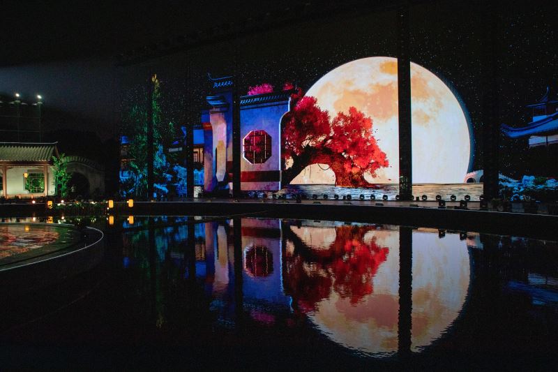 今年的总台秋晚主舞台以“圆”为主造型,圆中有圆,三“圆”叠加:第一个“大圆”,是集合了江南水乡、苏州园林元素的暨阳湖生态园;第二个“中圆”,是生态园内一个直径60米的360度全景舞台;第三个“小圆”,是在全景舞台的中央水面区里打造的一个直径13米的表演舞台。水、景、月、人互为映衬,共同烘托温馨、浪漫、团圆的中秋氛围。