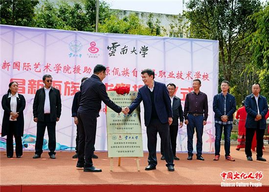 在沧源佤族自治县职业技术学校全体师生的掌声中,唐兴平与周昌新共同为昌新佤族艺术班揭牌。