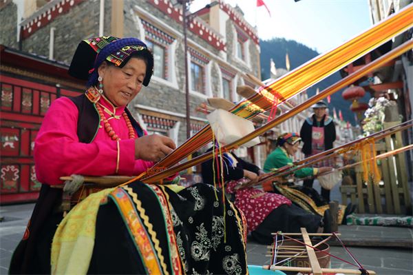 近日,位于四川省阿坝藏族羌族自治州理县古尔沟镇丘地村,妇女在街边织花腰带。王磊 摄