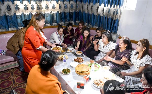 和田地区皮山县木奎拉乡康达库勒村妇女相聚在一起品美食、拉家常(拍摄于2023年3月)。石榴云/新疆日报记者 拍热扎提·阿不都 摄