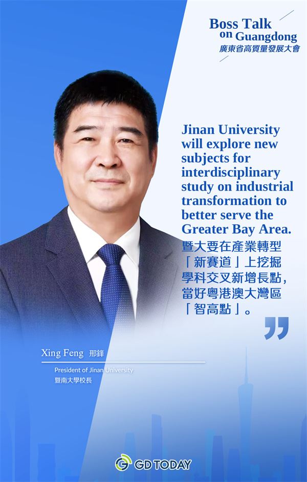 2月18日,广东省高质量发展大会在深圳召开。政府、科技、教育、企业等各界人士围绕高质量发展展开热议,锚定新一年发展目标。暨南大学校长邢锋在接受GDToday记者专访时表示,暨南大学作为国内规模最大的港澳台侨高素质人才培养基地,将继续坚持“侨校+名校”的发展战略,为广东省高质量发展提供人才、科研和智库三方面的支持。
