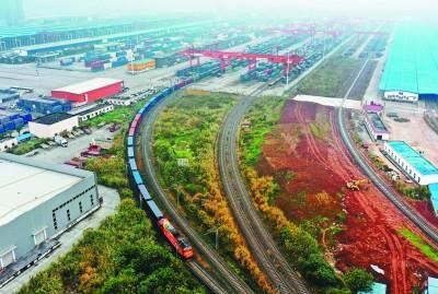 1月1日上午,重庆、成都两地同时发出2021年中欧班列(成渝)号第一趟列车。满载电子产品、机械零件、智能家电的两列中欧班列一路向西,驶往欧洲的德国杜伊斯堡和波兰罗兹。2020年,成渝两地中欧班列开行数量近5000列,历年累计开行量达14000列,占全国开行总量40%以上。图为中欧班列(成渝)号首列班车从重庆团结村站发出。新华社记者 唐奕摄