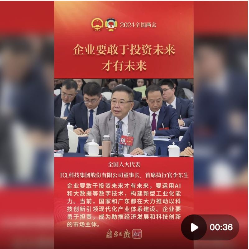 “企业要敢于投资未来才有未来。”现场,全国人大代表,TCL科技集团股份有限公司董事长、首席执行官李东生表示,发展科技制造业需要大力度的资本投入,企业要敢于投资未来才有未来,要运用AI和大数据等数字技术,开发工业软件和高端装备,构建新型工业化能力。当前,国家和广东都在大力推动以科技创新引领现代化产业体系建设。企业要敢于担责,成为助推经济发展和科技创新的市场主体。