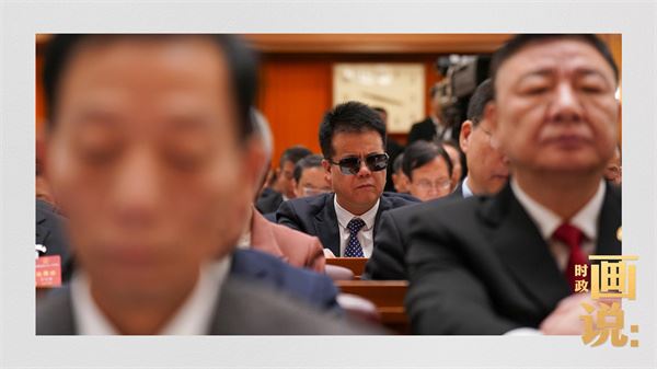 △指尖听会。视障人士、全国人大代表王永澄抚摸着特制的盲文版报告。