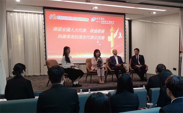 三位港區全國人大代表和全國政協委員向在粵港生兩會感受,解讀兩會精神。(記者盧靜怡 攝)