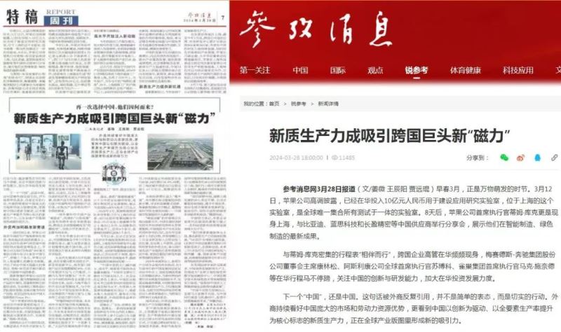 早春三月,生机盎然。随着中国政府持续释放高水平开放的政策信号,外资在华动作频频。近期,跨国公司高管密集现身中国,穿梭在各大重要会议的会场,与新老朋友洽谈合作,寻找商机:苹果公司高调宣布在深圳和上海新设应用研究实验室,阿斯利康宣布新建创新药厂,众多跨国汽车巨头纷纷发布在华布局研发中心的计划……在众多投资计划和关注重心里,不难发现,“新质生产力”正在成为关键词。《参考消息》就推出特稿:新质生产力成吸引跨国巨头新“磁力”;《光明日报》《中国青年报》等媒体也纷纷刊发新质生产力与外资动向的观察文章。
