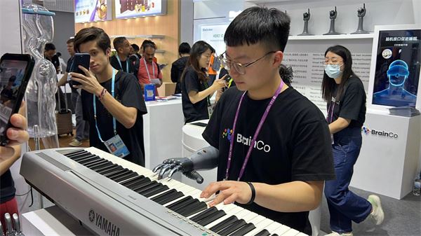強腦科技仿生手體驗官周鍵用仿生手彈琴。(大公文匯網記者 帥誠 攝)