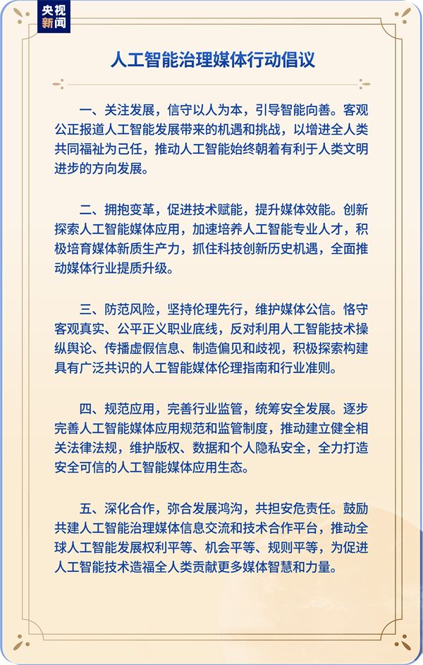 该倡议由中国中央广播电视总台与亚洲—太平洋广播联盟、阿拉伯国家广播联盟、非洲广播联盟、欧洲新闻交换联盟、拉美新闻联盟等国际媒体组织联合发起,倡导关注发展,信守以人为本,引导智能向善;拥抱变革,促进技术赋能,提升媒体效能;防范风险,坚持伦理先行,维护媒体公信;规范应用,完善行业监管,统筹安全发展;深化合作,弥合发展鸿沟,共担安危责任。