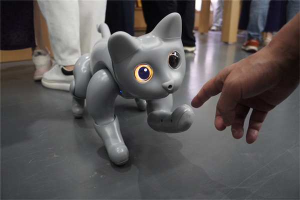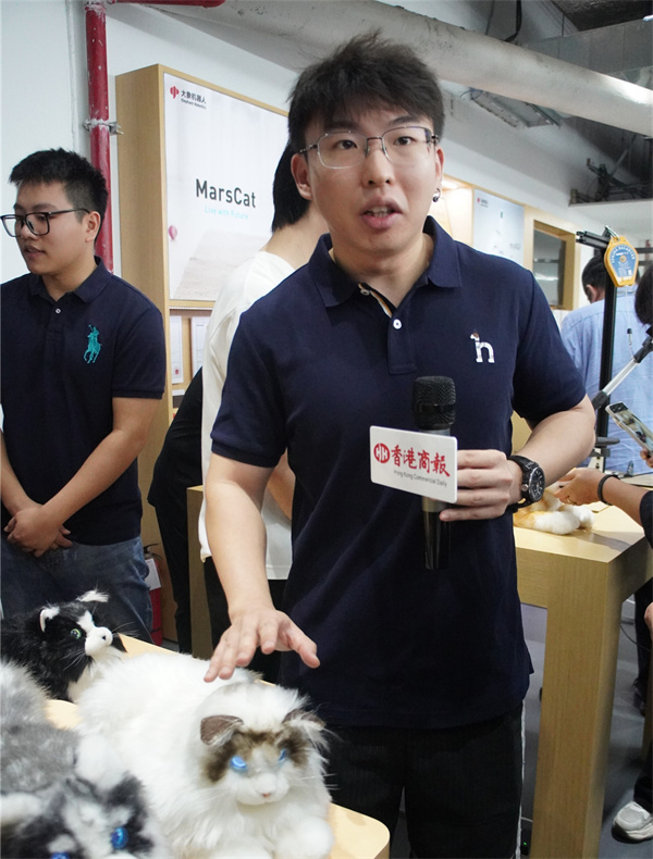 現場展出的仿生機器貓升級版成為大家的關注焦點,傳媒高層紛紛與其互動拍照。撫摸機器貓,它會發出咕嘟咕嚕的呼嚕聲,跟她說I love you,貓眼睛會冒愛心……陳昊天介紹稱,升級版機器貓根據市場需求進行升級,主打老年人市場,以互動陪伴治療老年人的孤獨感,在美國也有銷售。
