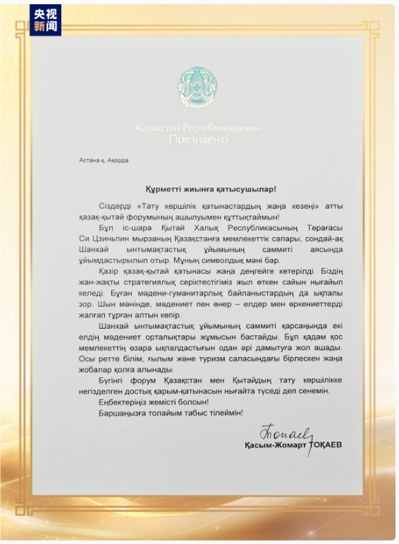 托卡耶夫在贺信中指出,本次活动是在中华人民共和国主席习近平访问哈萨克斯坦期间举办的,也是上合组织峰会框架下的活动,具有标志性意义。在睦邻友好基础上构建起的哈中双边关系已经迈上了新台阶,两国永久全面战略伙伴关系正逐年得到巩固,民间交往和文化交流在此发挥了重要作用。