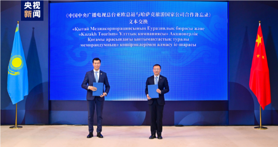 △中央广播电视总台亚欧总站站长王斌与哈萨克旅游国家公司董事会主席萨德瓦卡索夫交换《中国中央广播电视总台亚欧总站与哈萨克旅游国家公司合作备忘录》